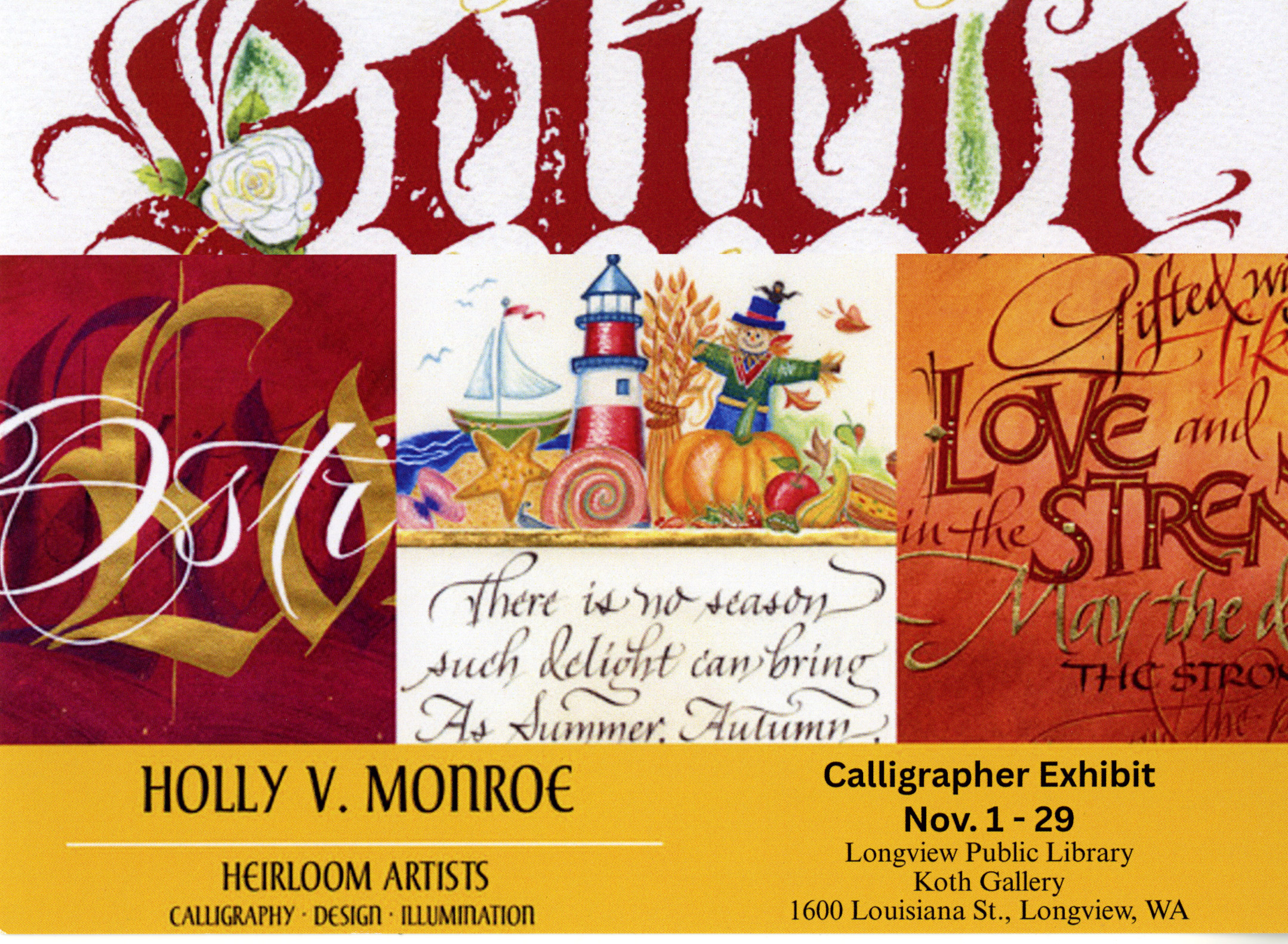 Holly Monroe is a third generation Lake Oswego calligrapher and illuminator with a deep appreciation for beautiful lettering and fine art. Specializing in hand lettered designs created in a variety of categories….Awards, Bible Verses, Books, Family Trees, Greeting Cards, Logos, Weddings & Invitations, Framed Originals, etc. on handmade paper or calfskin with illustration, gold & palladium leaf. Learn More»